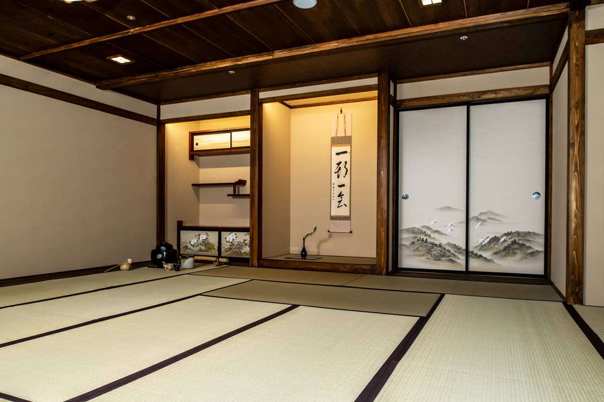 The tea ceremony begins by being welcomed into the tea room by the host, also called the "teishu", where the tools and utensils are laid out ready to be used for the ritual. While everyone is expected to sit on the tatami mats arranged on the floor, wooden chairs are provided for those who choose not to. Comfort is prioritized at Maikoya, so you are welcome to sit however you like!