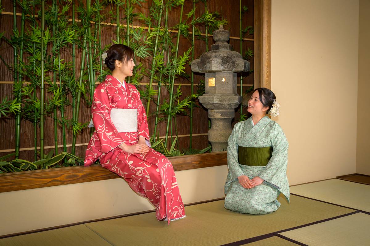 You can take many photos by wearing an authentic kimono in the beautiful Japanese gardens of Maikoya. You can even wear your kimonos outside after your tea ceremony.